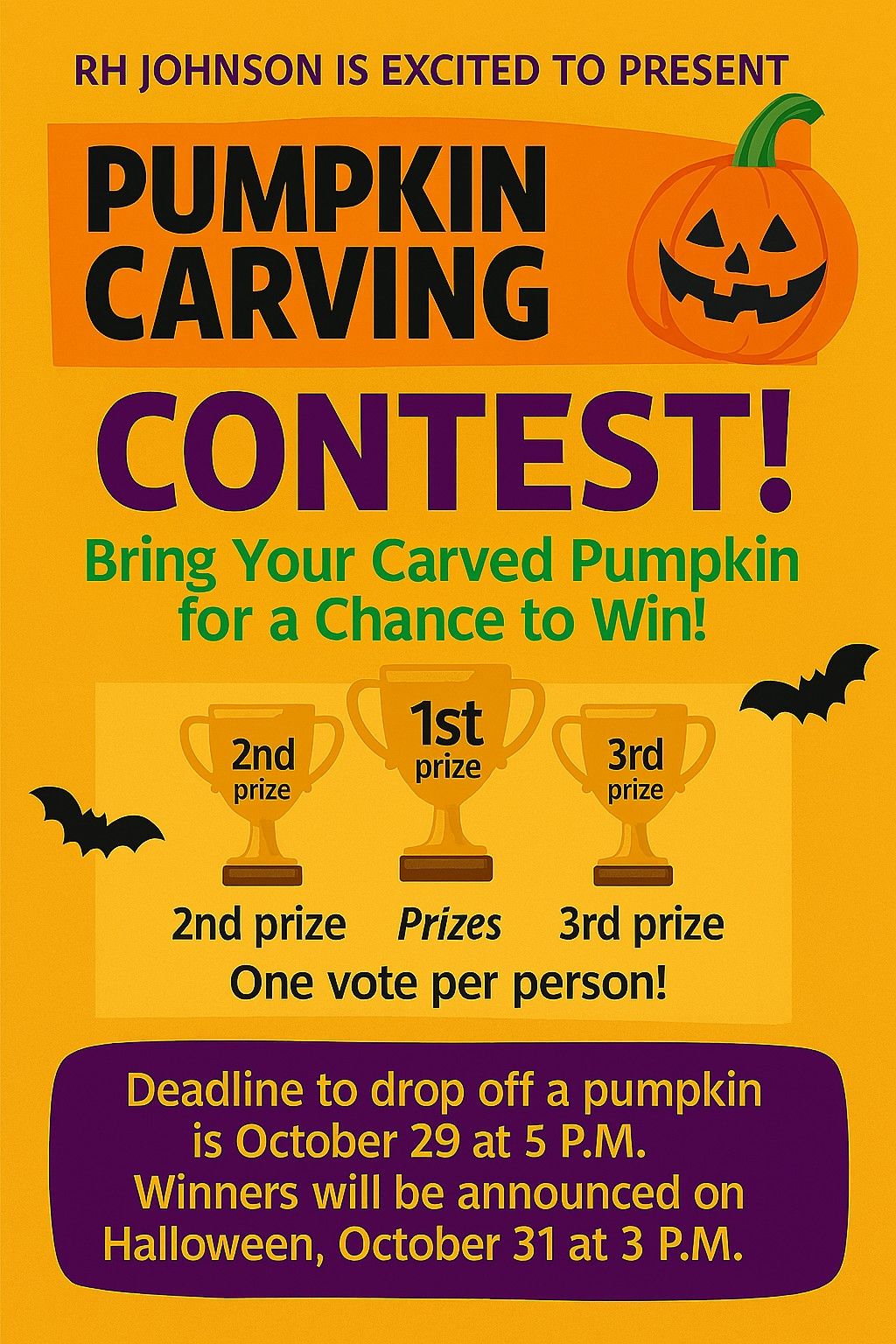 [Sun City West] Show off your creativity this Halloween with the SCW Rec Centers' pumpkin carving contest! Members are invited to carve a pumpkin during their free time over the next week and enter it into this upcoming contest where voting by other community members will decide 1st, 2nd and 3rd place. If you're interested in participating, pumpkins for this contest need to be dropped off at the lobby of the R.H. Johnson Pool and Fitness Center prior to 5 p.m. on Wednesday, Oct. 29. Voting by the public will occur after the submission deadline, with winners being announced on Halloween at 3 p.m.