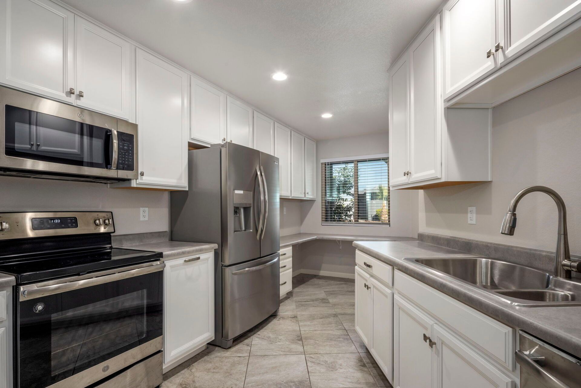 HOME OF THE WEEK: Opportunity knocks in Sun City! Say goodbye to 70s style, no astroturf patio or avocado appliances here!! This unit had extensive remodeling in 2019, including the bathrooms, kitchen, all appliances & fixtures, windows & doors. Lots of natural light in the family room from the oversized double sliding patio door, plus a 9' ceiling. All the stainless steel appliances and washer & dryer are included, roof was recoated in December & garage door & opener were replaced in January. This end unit is turnkey, and one of the best you will find, don't miss out, see it today. Seller is offering $3,000 credit for carpet replacement.
