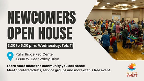 [Sun City West] Are you new to Sun City West? Stop by the ‘Newcomers Open House‘ on Wednesday, February 11th, from 330-530pm at the Palm Ridge Rec Center to learn more about the community & meet with the various clubs & departments. This event is free.