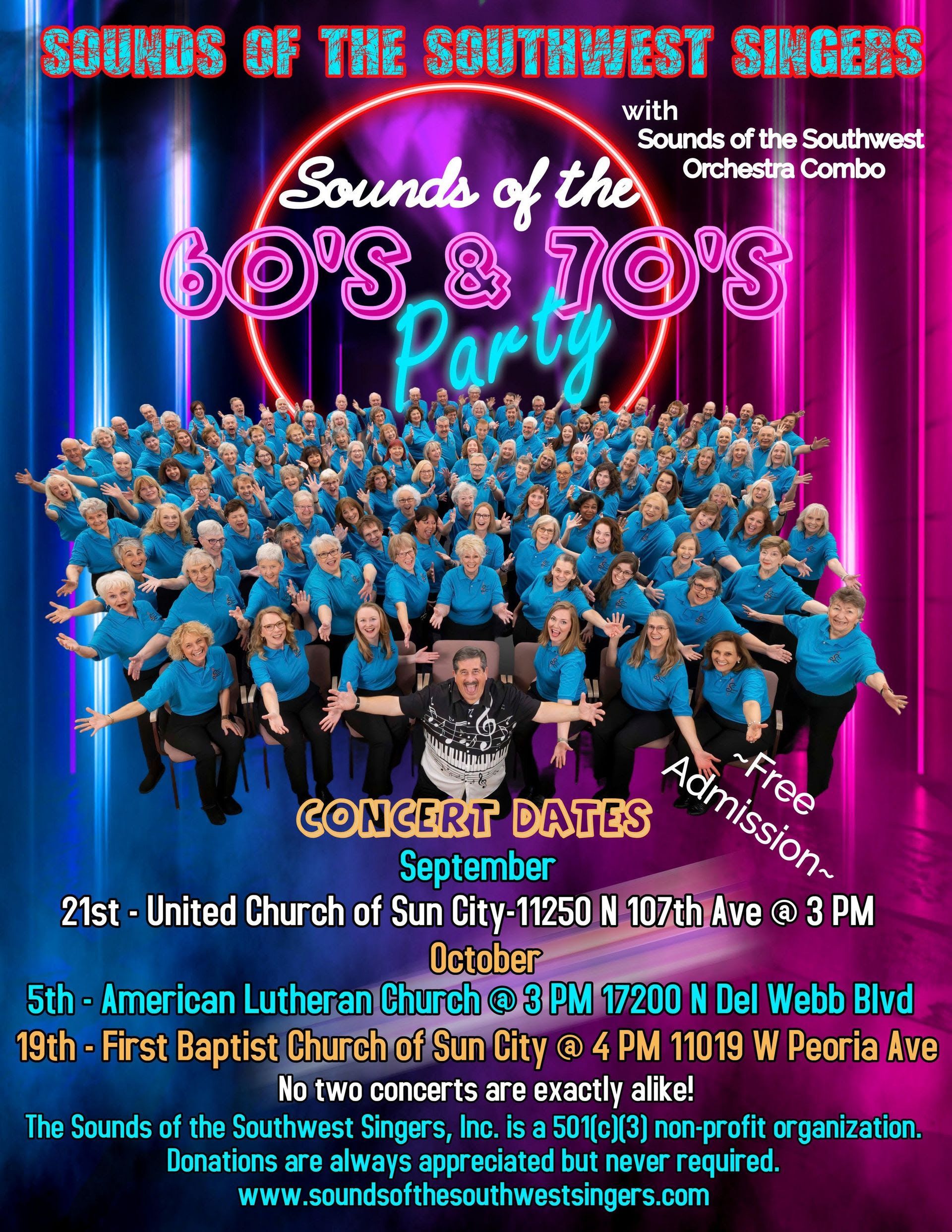 [Sun City] Sounds of the Southwest Orchestra Combo will be performing ‘Sounds of the 60’s & 70’s Party’ on Sunday, October 19th, at 4pm at First Baptist Church of Sun City. (link & map)
