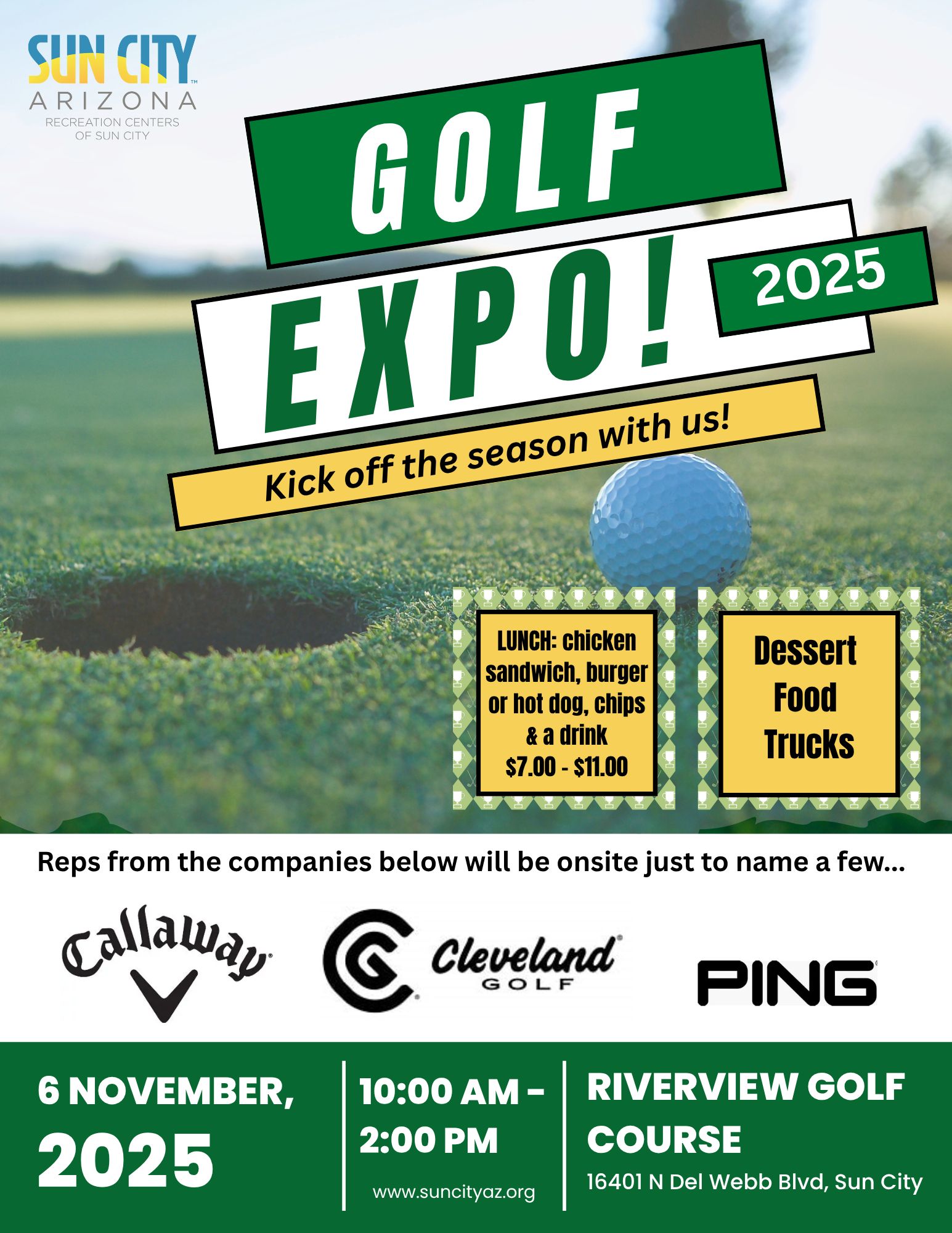 [Sun City] Kick off the golf season with the Sun City Golf Expo 2025, on Wednesday, November 6th from 10am-2pm at the Riverview Golf Course. Several manufacturer sales reps will be on hand to answer your questions and get you set up right for the winter golfing season.