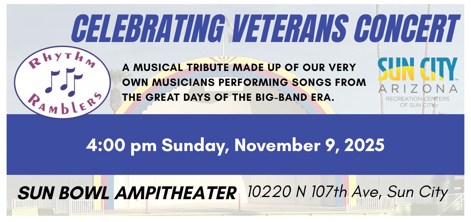 [Sun City] Enjoy the sounds of The Rhythm Ramblers, on Sunday, November 9th, at 4pm at the Sun Bowl Amphitheater. Join us for a musical journey tribute to our Sun City Veteran’s at this very special concert with our very own musicians from the great days of the big-band era! (link)
