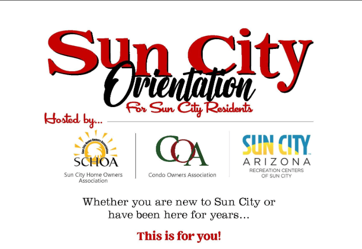 Sun City Resident Orientation Friday, November 7, 2025. Doors open: 8:30am Meeting starts: 9:00amLocation: Sundial Recreation Center, 14801 W. 103rd Ave, Sun City.