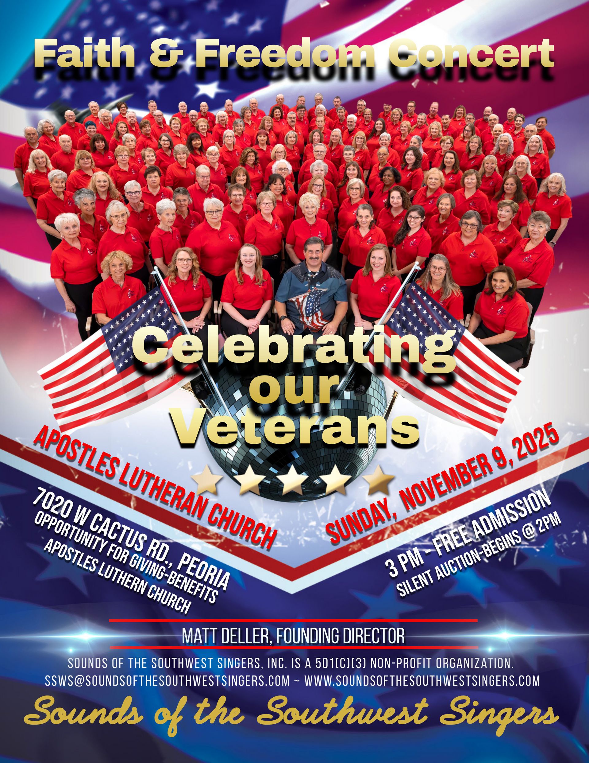 [Peoria] The Sounds of the Southwest Singers will be performing on Sunday, November 9th, at 3pm at the Apostles Lutheran Church in Peoria. This event will be ‘Celebrating Our Veterans’ and promises to be a great show like always!!. (link & map)